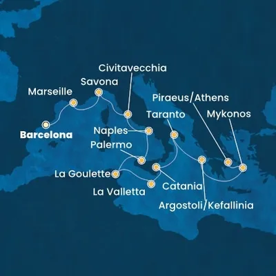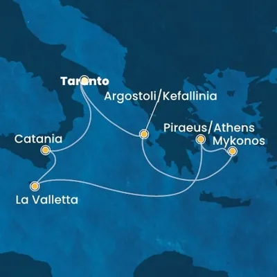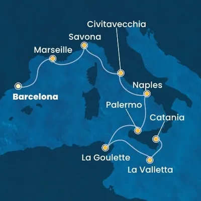 Catane sert également de port d'embarquement/débarquement pour certaines croisières méditerranéennes, avec accès facile depuis l'aéroport Catane-Fontanarossa (7 km, 15 minutes).
