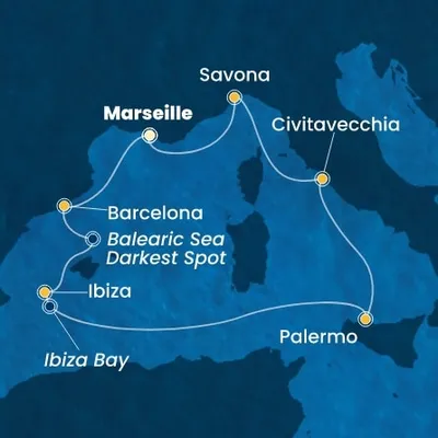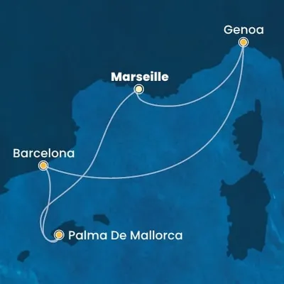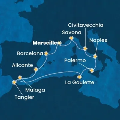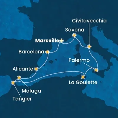 Embarquez sur le Costa Toscana pour une aventure qui vous emmène au cœur de la Méditerranée Occidentale. Il est tout à fait possible d'embarquez sur ce navire au départ de Marseille avec Costa. Laissez-vous séduire par Lisbonne, Barcelone, Madrid et Savone, où chaque destination promet émerveillement et découvertes.