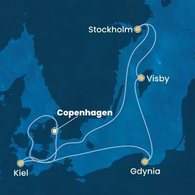 Copenhague (Danemark), Gdynia (Gdansk) (Pologne), Visby (Suède), Stockholm (Suède), Kiel (Allemagne)