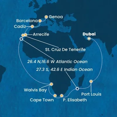 Dubaï (Émirats arabes unis), Port Louis (Maurice), Port Elizabeth (Afrique du Sud), Le Cap (Afrique du Sud), Walvis Bay (Namibie), Arrecife, Lanzarote (Espagne), Santa Cruz De Tenerife (Espagne), Cadix (Espagne), Barcelone (Espagne), Gênes (Italie)