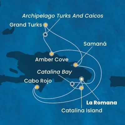 La Romana (République dominicaine), Sainte-Lucie (Sainte-Lucie), Barbade (Barbade), Pointe-à-Pitre (Guadeloupe), Saint Kitts (Saint-Christophe-et-Niévès), Tortola (Îles Vierges britanniques), Ile Catalina (République dominicaine), Samana (République dominicaine), Grand Turk (Îles Turques-et-Caïques), Amber Cove (République dominicaine)...