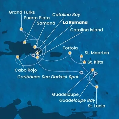 La Romana (République dominicaine), Ile Catalina (République dominicaine), Samana (République dominicaine), Grand Turk (Îles Turques-et-Caïques), Amber Cove (République dominicaine), Cabo Rojo (Porto Rico), Fort De France (Martinique), Barbade (Barbade), Pointe-à-Pitre (Guadeloupe), Saint Kitts (Saint-Christophe-et-Niévès)...