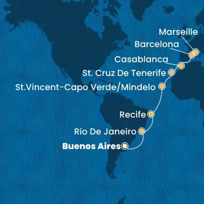 Buenos Aires (Argentine), Rio De Janeiro (Brésil), Recife (Brésil), Mindelo (Cap-Vert), Santa Cruz De Tenerife (Espagne), Casablanca (Maroc), Barcelone (Espagne), Marseille (France)