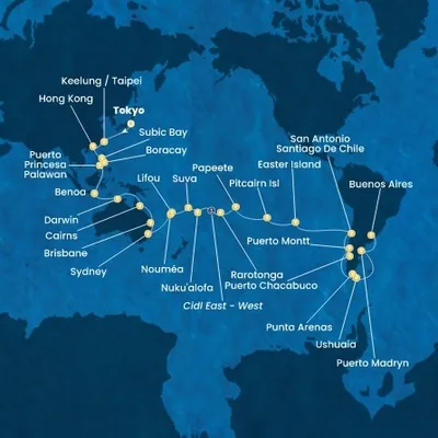 Les ventes n'étant pas encore ouvertes, plus d'informations sur l'itinéraire et les escales arriveront prochainement. Mais d'après ce que nous savons à l'heure actuelle, l'itinéraire du Tour du Monde de Costa se concentrera sur l'hémisphère sud du globe. Ainsi, d'après nos premières informations, le Tour du Monde 2025 vous permettra de découvrir la Terre de Feu, la Nouvelle-Zélande, l'Australie, la Polynésie et l'Afrique du Sud.